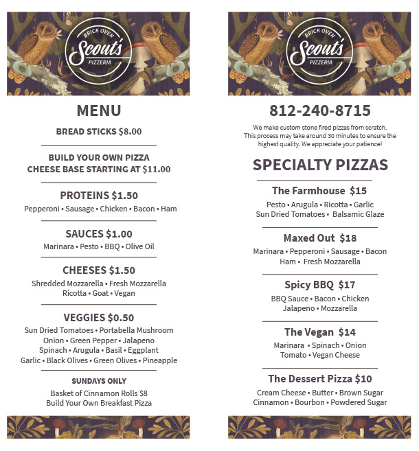 Scout's Pizzeria is located in Terre Haute, IN and provides quality artisan Brick Oven Pizzas. Our goal was to create a clean and fresh look for the branding.